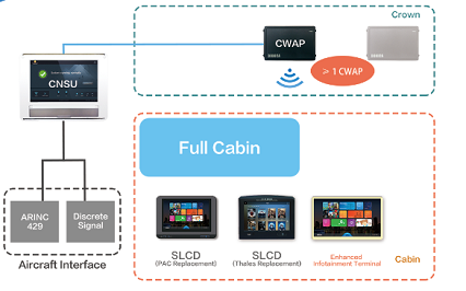 DONICA 的WAVOD 系统是由客舱网络服务单元 (CNSU)、客舱无线接入设备 (CWAP )与智能终端(SLCD)部件组网,系统软件包括OAM 软件、SLCD App 及对客Portal软件。